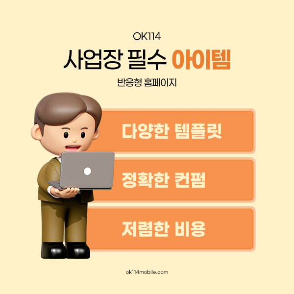 PC를 많이 사용하던 이전과 다르게 스마트폰 보급률이 높아지면서 PC보다는 스마트폰으로 먼저 검색하게 됩니다.그래서 홈페이지도 스마트폰에 딱 맞게 보여야 합니다.화면 크기에 따라 자동으로 바뀌니까 고객이 어디서 접속해도 불편함이 없는 반응형 홈페이지는 이제 필수 아이템이 되었죠.한 번의 디자인으로 PC, 모바일, 태블릿 등 모든 기기에 적용되니까, 시간과 비용을 동시에 절약할 수 있는 실용적인 홈페이지예요!OK114의 반응형 홈페이지는 디자인도 세련되고 깔끔하게 나오니까 첫인상부터 신뢰감을 주기 좋고요.결과적으로, 홈페이지가 고객과 브랜드를 연결하는 강력한 매개체가 되어준답니다. 대표적으로 어떤 강점이 있는지 알아볼까요? 🌐 모든 기기에서 완벽한 연동하나의 홈페이지로 PC, 태블릿, 모바일까지 완벽하게..